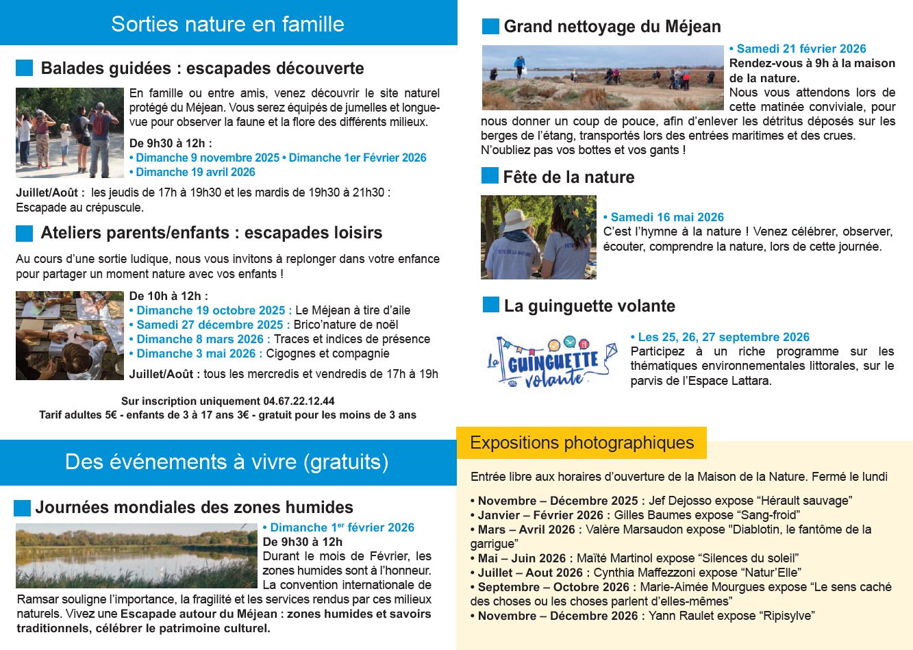 Des animations aux thématiques variées sont proposées toute l’année : visites encadrées (groupe,scolaire,…), animations grand public, événementiel (fête de la nature, journées mondiale des zones humides, grand nettoyage,…).