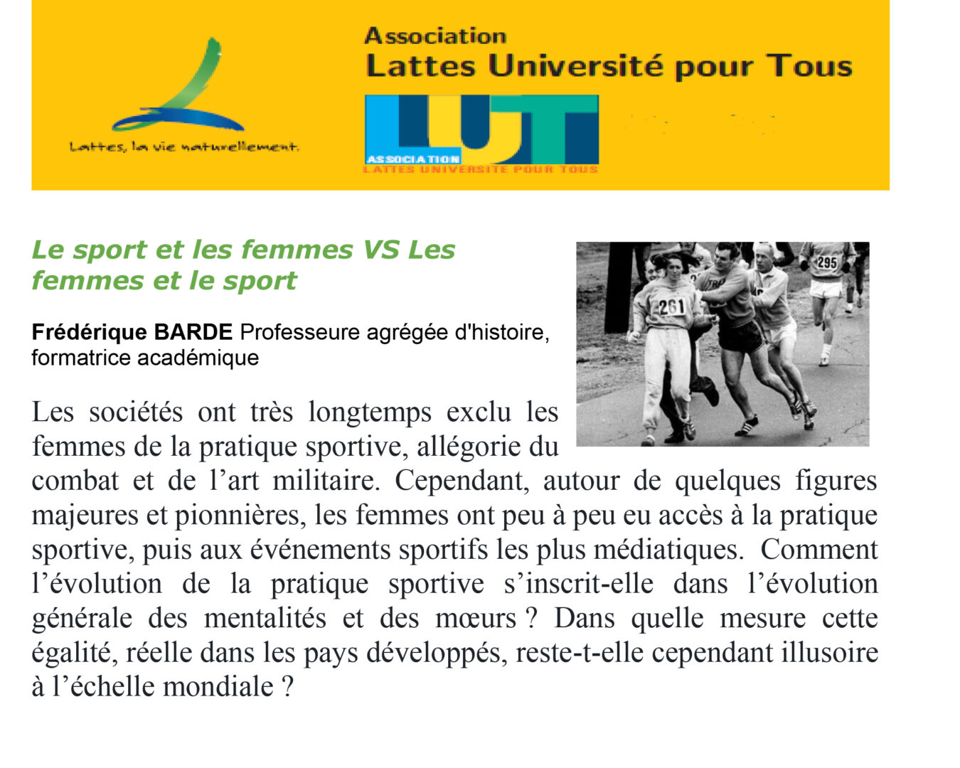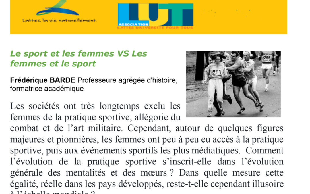 L’Association Lattes Université pour Tous (LUT) vous convie à une conférence captivante qui retrace l’histoire du sport féminin.