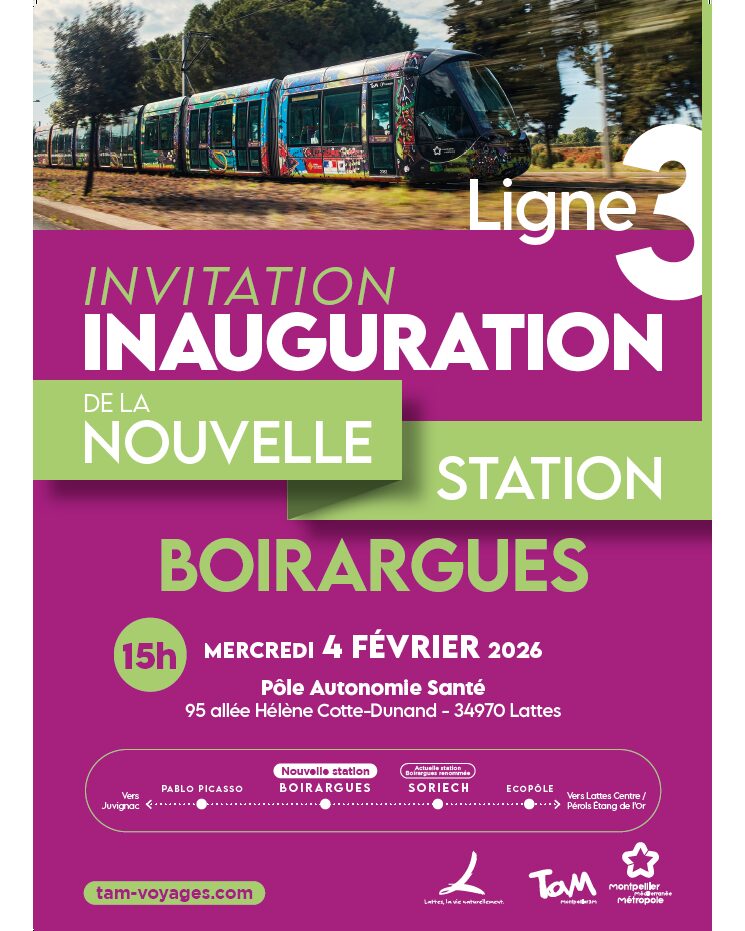 Montpellier Méditerranée Métropole, la Ville de Lattes et TaM vous invitent à l’inauguration officielle de la nouvelle station de tramway « Boirargues » sur la Ligne 3.
