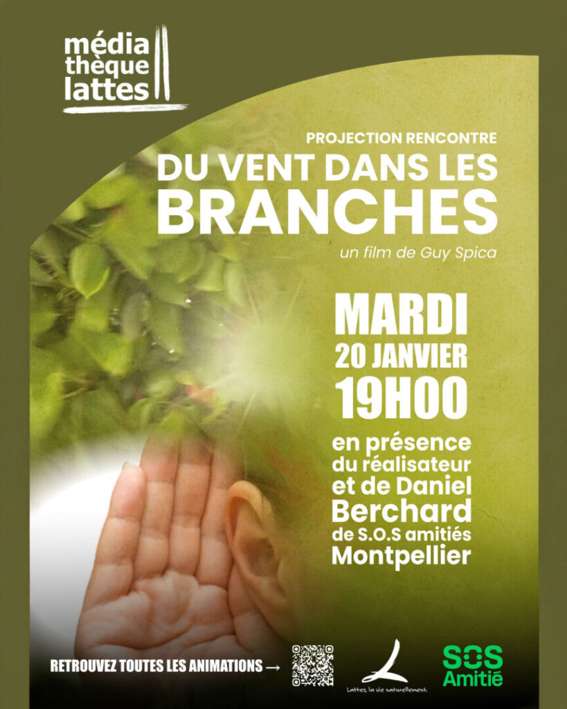 Le mardi 20 janvier à 19h00, venez assister à la projection du film « Du vent dans les branches ». Cette séance spéciale sera suivie d’un temps d’échange privilégié en présence du réalisateur, Guy Spica, ainsi que de Daniel Berchard, représentant de l’association S.O.S Amitié Montpellier.