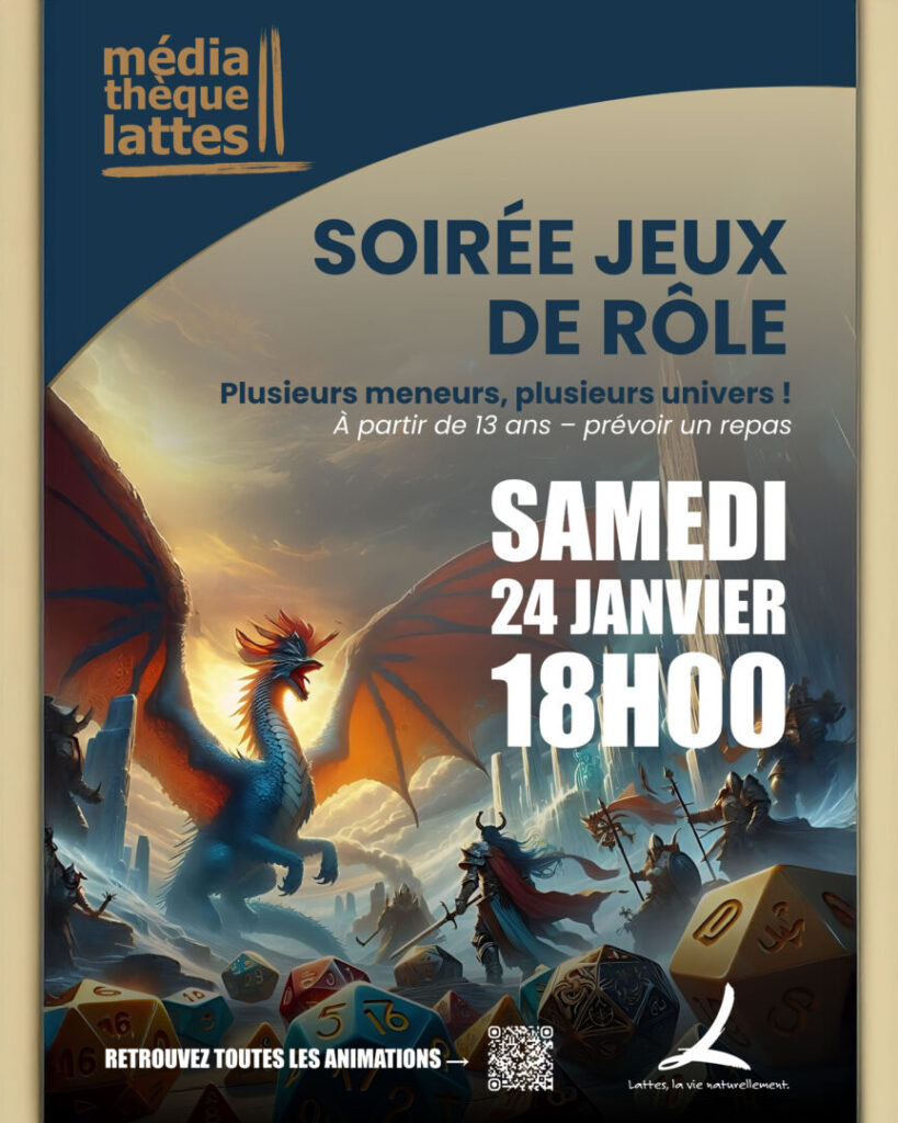 Prêts à affronter des dragons ou à explorer des mondes inconnus ? La Médiathèque de Lattes vous invite à une soirée immersive dédiée aux jeux de rôle.