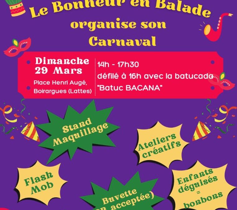 L’Association des Parents d’Élèves (APE) Le Bonheur en Balade vous invite à célébrer son grand Carnaval ! Venez partager un moment festif, musical et convivial en famille sur la Place Henri Augé.