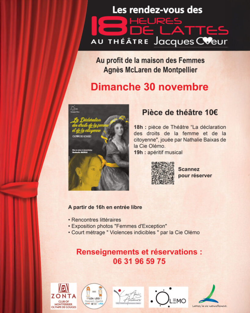 - À 18h (Tarif 10€) : Pièce de théâtre « La déclaration des droits de la femme et de la citoyenne ». Un seul en scène interprété par Nathalie Baixas (Cie Olémo) mettant en lumière le texte fondateur d’Olympe de Gouges.